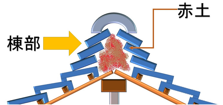 古い屋根ではほとんどが赤土と藁を練り合わせた粘土状のものを使用しています。 赤土が空気中の湿気を吸い、また乾燥するということを繰り返しているうちに徐々に砂状化して積み上げた瓦を支えきれなくなり倒壊してしまう場合がほとんどで、寒い地域で特に多いです!