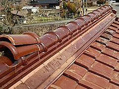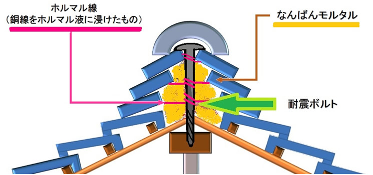 屋根の頂点(棟木)に耐震ボルトを打設(60cm間隔)します。赤土部を湿気に強いなんばんという素材に交換する事で風化に強くします。またのし瓦一枚ずつ被覆鉄筋を結束し、さらにのし瓦ずつにホルマル線で結束することにより強い揺れでも瓦の落下・倒壊を最小限にくい止める事が出来ます(別途費用がかかります)