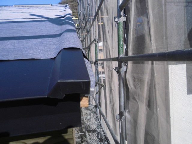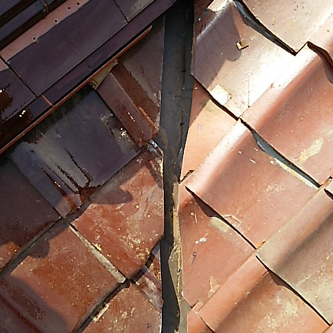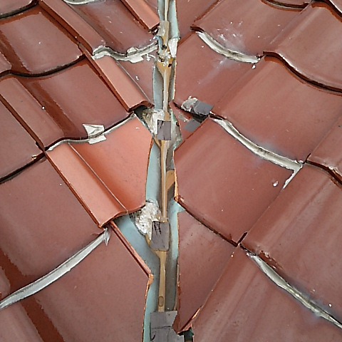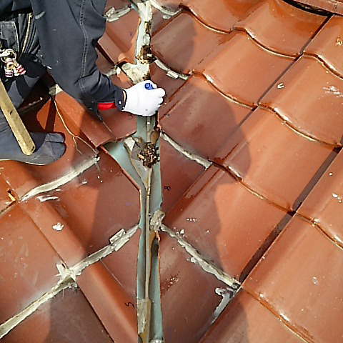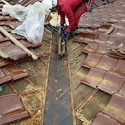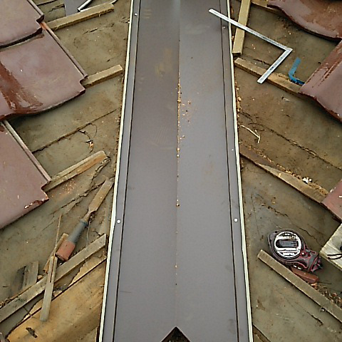 既設の谷板金の材質が銅・鉄の場合、経年劣化・酸性雨により穴や破損が生じ、雨水が屋根下に伝い雨漏りを起こしていた。 材質をガルバリュウム塗装板に替え施工した。