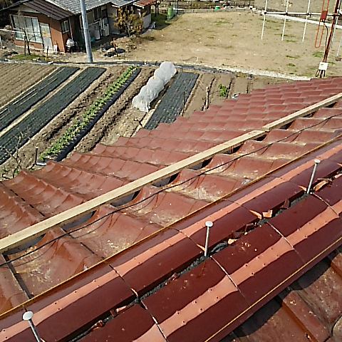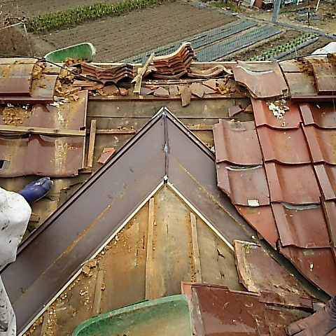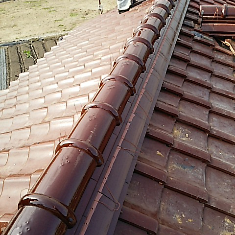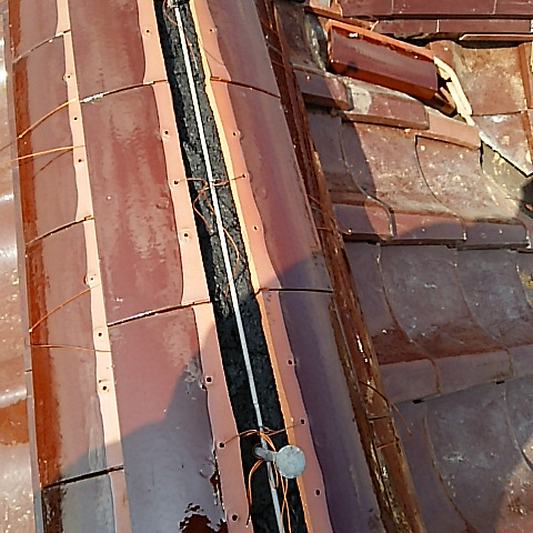 経年劣化による赤土の砂状化による棟の劣化・崩壊、瓦も劣化していたので全て交換し、赤土の代わりになんばん・モルタルを使用。耐震ボルトを打設、被服鉄筋を流して緊結、鉄筋と瓦同士をホルマル線により緊結しました。